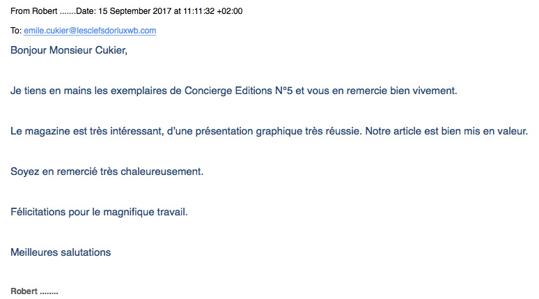 Je tiens en main les exemplaires de Concierge N°5 et vous en remercie bien vivement. Le magazine est très intéressant, d’une présentation graphique très réussie. Notre article est bien mis en valeur. Soyez en remercié très chaleureusement.